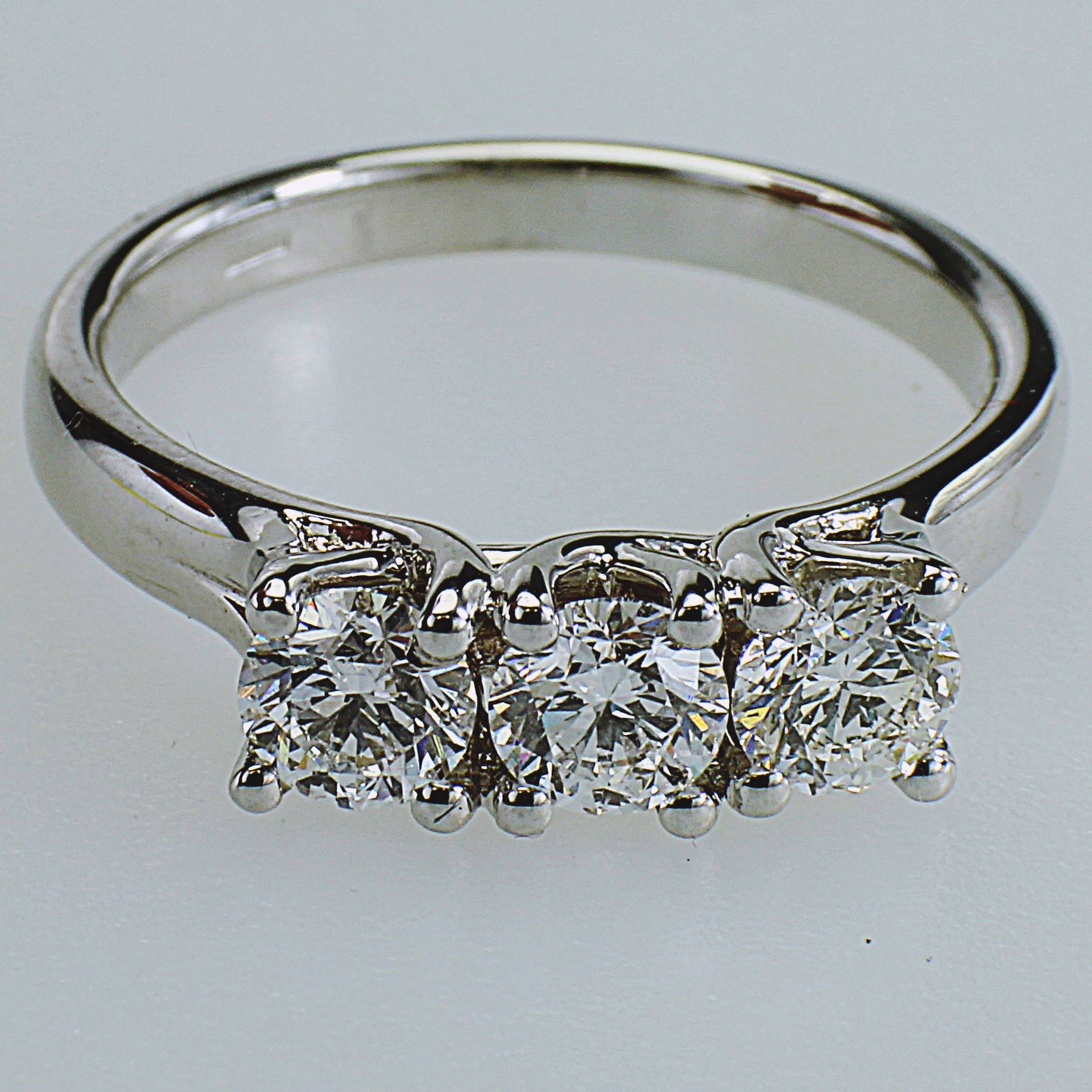 ANELLO TRILOGY A SCALARE IN ORO TITOLO 750°°° CON DIAMANTI KT 1,11 TOTALE – DIAMANTE CENTRALE KT 0,50 COLORE D PUREZZA S CERIFICATO I.G.I. NR. 561258315 E DIAMANTI LATERALI KT 0,30 E KT 0,31 COLORE E PUREZZA S CERTIFICATI I.G.I. NR. 579356213 E NR. 579356